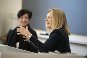 Allen is a member of the American Academy of Arts and Sciences, started in 1780 by John Hancock, John Adams, and other founding fathers who, she said, saw the “need for the learned professions to partner with those who had responsibility for steering the ship of state.” She discussed the kinds of partnering required by recounting her own academic journey, during which she encountered partnerships between professors and students and across lines of race, culture, and academic discipline. “At the end of the day, democracies require judgment,” she said. “They ask ordinary people to come together to make judgments about the direction a society should choose.” She compared universities with symphony conductors in their ability to bring together various kinds of understanding to support good decisions.
